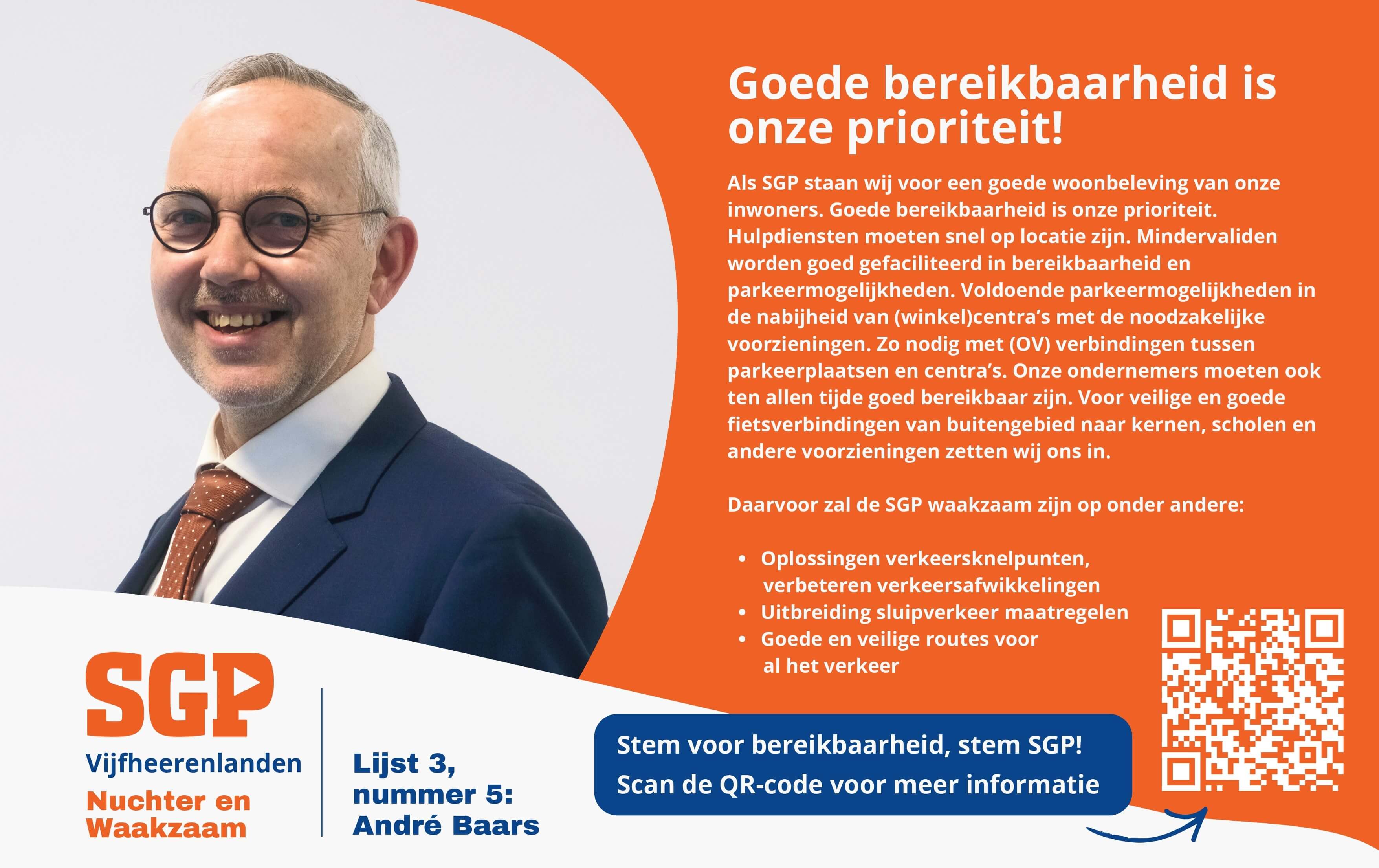 Als SGP staan wij voor een goede woonbeleving van onze inwoners. Goede bereikbaarheid is onze prioriteit. Hulpdiensten moeten snel op locatie zijn. Mindervaliden worden goed gefaciliteerd in bereikbaarheid en parkeermogelijkheden. Voldoende parkeermogelijkheden in de nabijheid van (winkel)centra’s met de noodzakelijke voorzieningen. Zo nodig met (OV) verbindingen tussen parkeerplaatsen en centra’s. Onze ondernemers moeten ook ten allen tijde goed bereikbaar zijn. Voor veilige en goede fietsverbindingen van buitengebied naar kernen, scholen en andere voorzieningen zetten wij ons in.